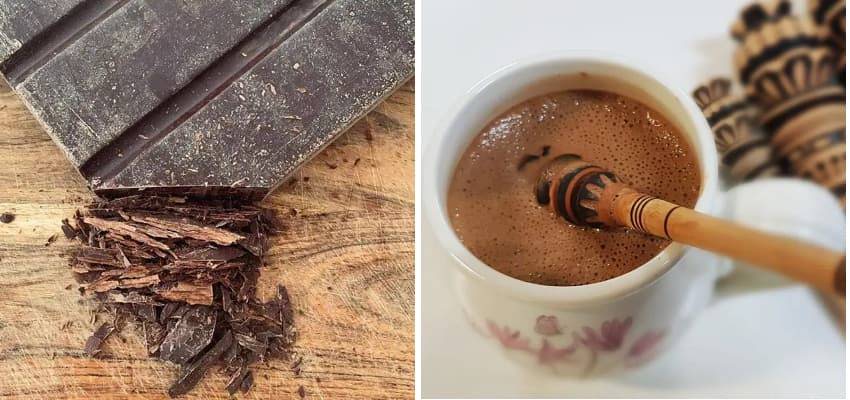 Block of ceremonial Criollo cacao paste and cacao elixir whisked by traditional Molinillo whisk.
